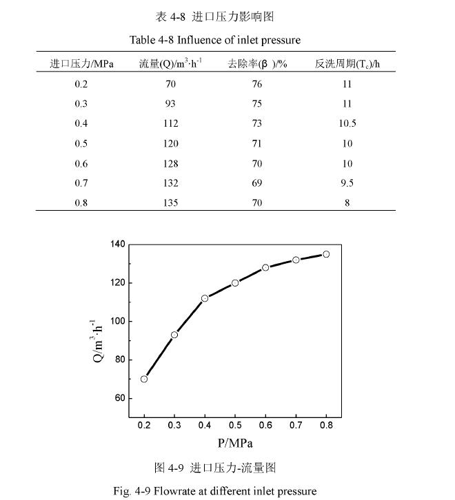 考慮到隨著陶瓷膜的堵塞,流量必然要不斷下降,所以適量提高初始運(yùn)行流量將起到一個(gè)平衡作用來確保處理量。綜合處理效果和經(jīng)濟(jì)因素,確定進(jìn)口壓力為,反洗時(shí)間。