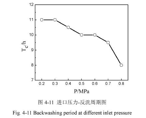 從圖來看,反洗的周期在進(jìn)口壓力超過以后迅速下降。經(jīng)過分析,可能是因?yàn)閴毫^大以后,在陶瓷膜的內(nèi)外壁的壓差也隨之,容易在膜的表面形成較致密的污染層;另一方面,過大的壓力導(dǎo)致沉淀區(qū)出現(xiàn)過多的擾動(dòng),使本已沉淀下來的磷酸銨鎂浮動(dòng)起來,惡化了膜表面的堵塞情況。