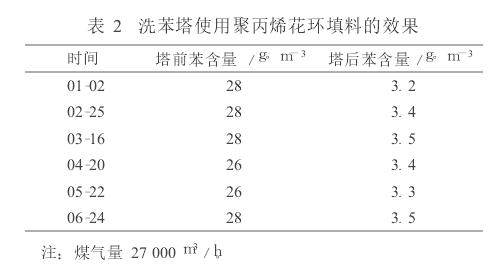 山西古縣一焦化廠 3 600mm× 3 000mm洗苯塔使用的是聚丙烯花環(huán)填料,裝填填料163m 3,配套600kt/a焦化項(xiàng)目,填料總造價(jià)26.08萬元。自2004年12月投產(chǎn)至今,經(jīng)多次蒸汽吹掃后花環(huán)填料層明顯下沉,塔后含苯較投產(chǎn)初期高。 2009年洗苯塔前、后苯含量如表2
