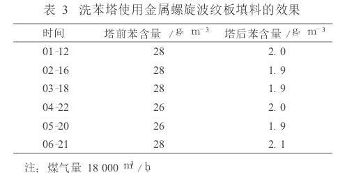山西古縣錦華焦化廠 2 800mm× 3 000mm洗苯塔采用的是金屬螺旋波紋板填料,裝填填料99m 3,配套400kt/a焦化項(xiàng)目,填料總造價(jià)59.40萬元。自2005年投產(chǎn)至今,使用效果尚可,其主要缺陷在于填料造價(jià)太高。 2009年洗苯塔前、后苯含量如表3。